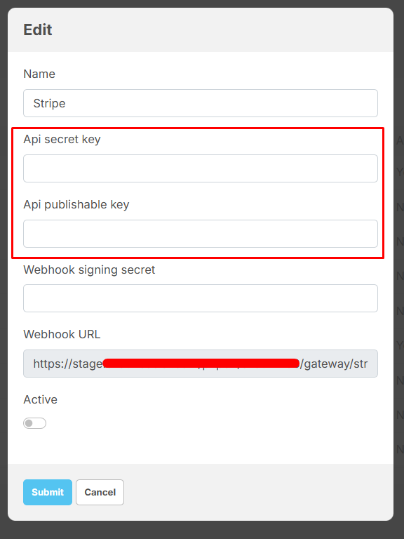 Active: allow you to enable/disable the Stripe payment gateway.