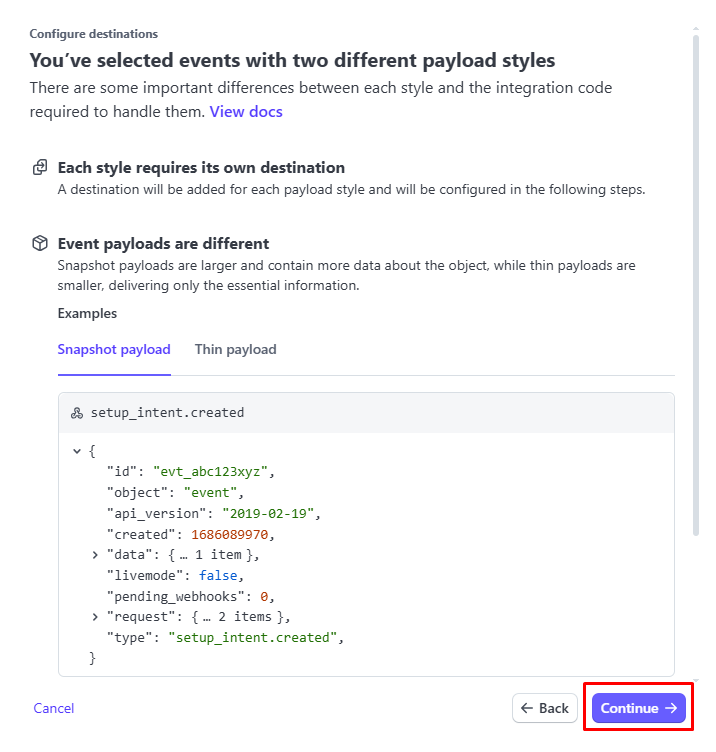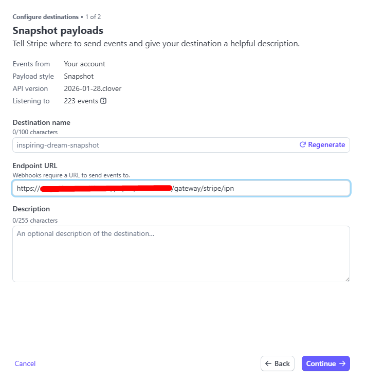 Paste Endpoint URL (webhook URL) → Continue