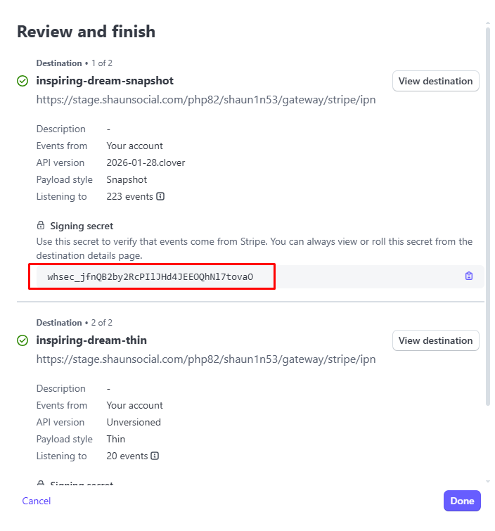 9. Copy Signing secret whsec_xxxx → Click Done