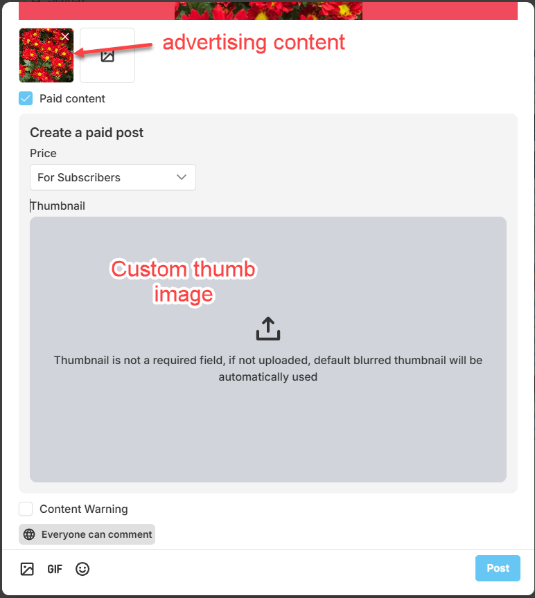 Option 1: using your own custom thumb image. You can create a custom thumb image, put your own advertising content on it and then upload to use it as cover of your paid content