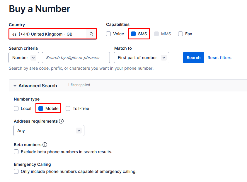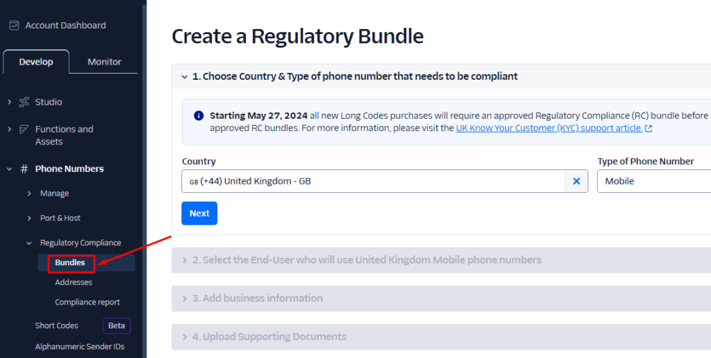 • Select your country and type of phone number is Mobile. If the country you select not support the mobile type, you can select (+44) United Kingdom instead => Next