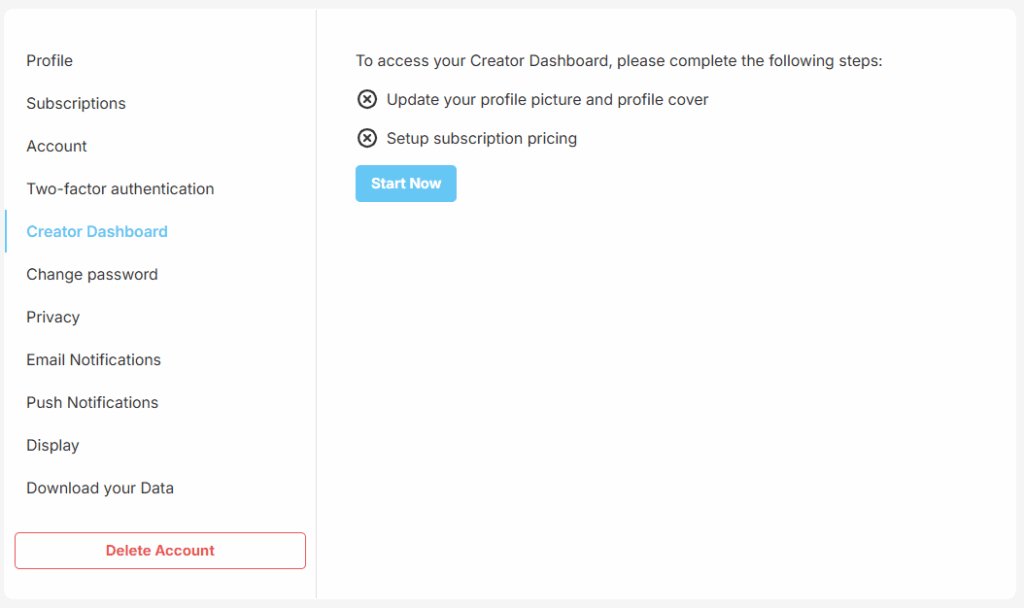 Or go to Setting –> Creator Dashboard –> Start Now to begin the creator setup process.