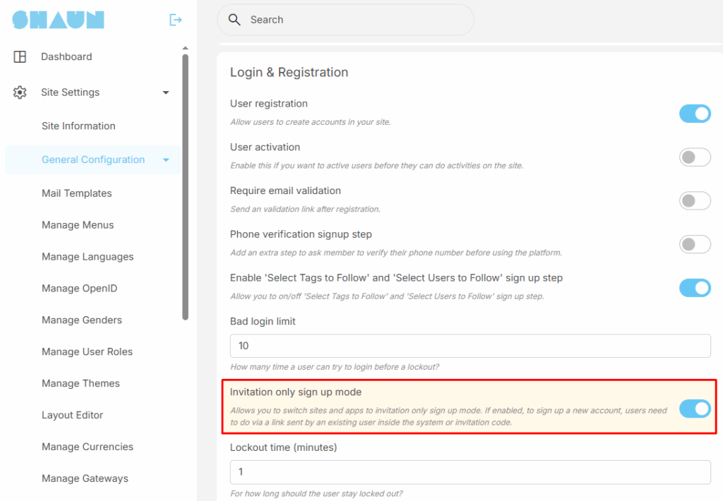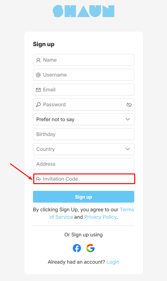If site owner turn site to invited only mode, to sign up a new account, users need to do via a link sent by an existing user inside the system or invitation code.
