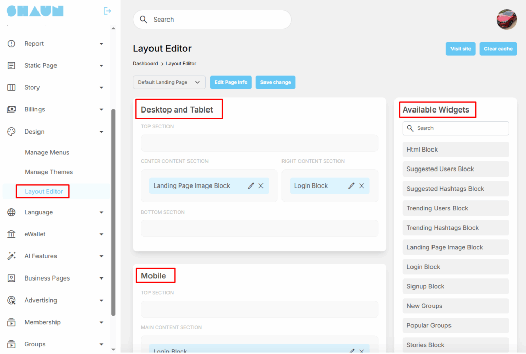 Layout editor: The layout editor allows you to arrange blocks at header, footer, left and right to suit your needs. You can add/remove existing blocks into any pages. You can do this at AdminCP -> System settings -> Layout editor.