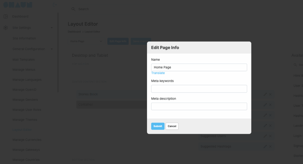 For each pages inside the platform, you can update title, description and keyword at admincp -> Site settings -> Layout Editor