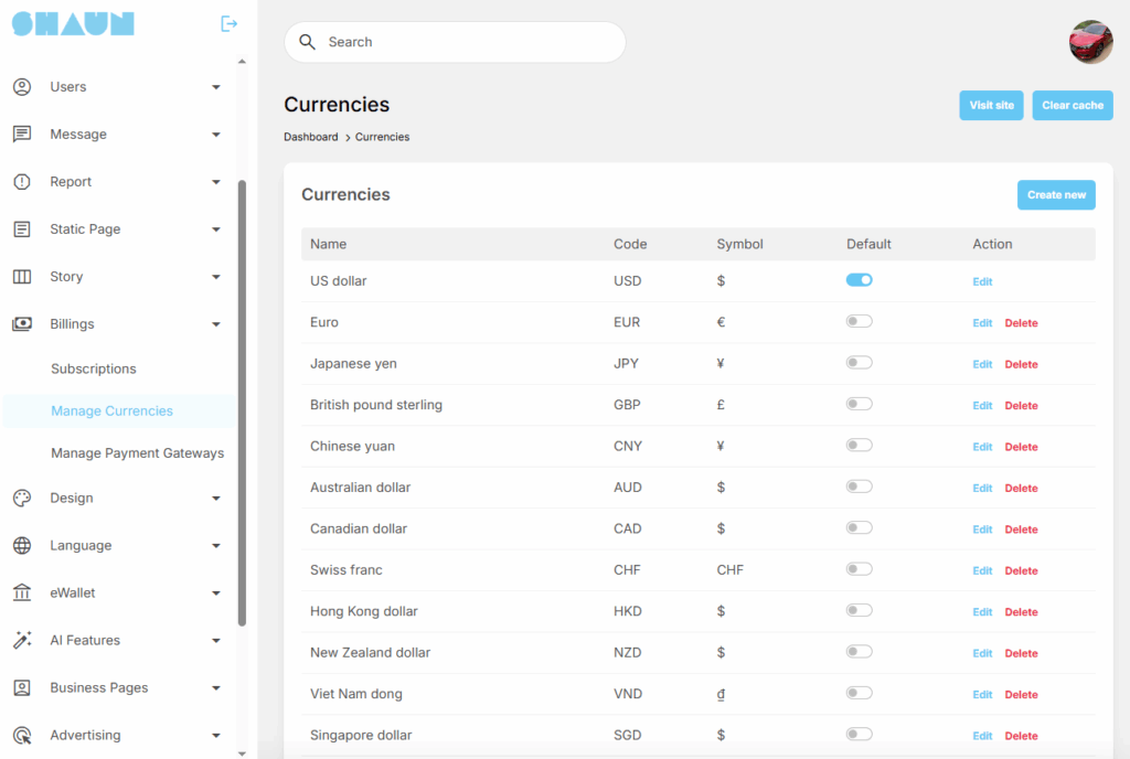 Shaun allows you to set fiat currency and site currency and the exchange rate between them.